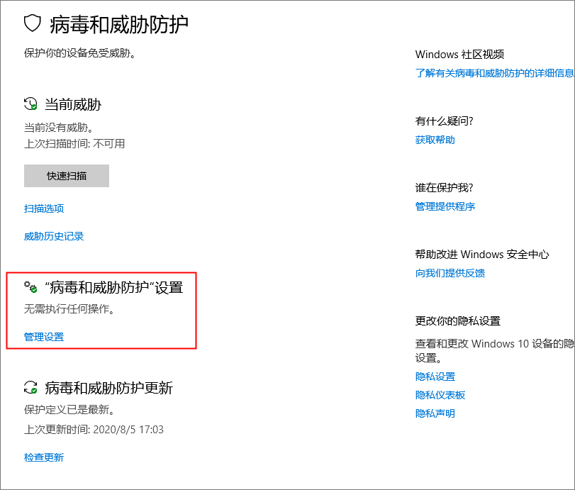 ③ 在病毒和威胁防护 下找到“病毒和威胁防护”设置,打开此选项