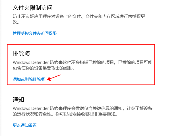 ④ 打开之后找到 排除项 ,选择“添加和删除排除项”,这里我们可以添加白名单或者删除已添加的白名单